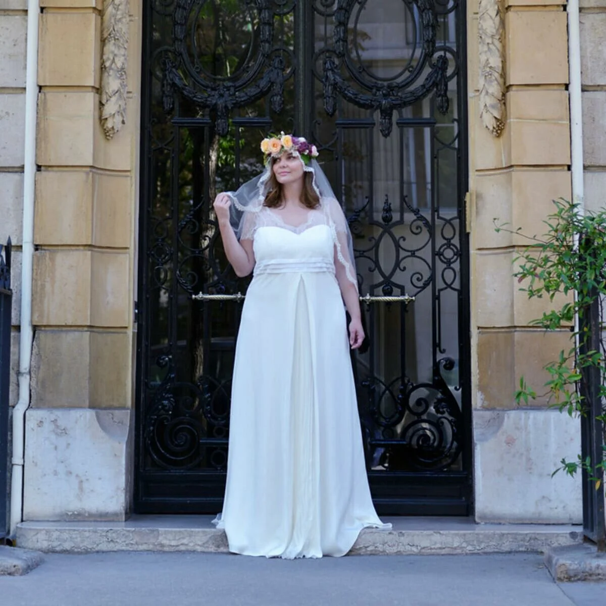 Côté mariée, bien entendu, les conseils donnés à vos témoins sont d’actualité. Hauts à fines bretelles, bustiers sont autant d’éléments qui sublimeront votre silhouette. Ces décolletés mettent en valeur votre haut du corps tout en subtilité et finesse. Les robes de taille empire ou coupe princesse rééquilibreront votre allure. Privilégiez également les matières fluides et légères telles que la mousseline, la soie ou la dentelle qui n’alourdissent pas la silhouette et ne rajoutent pas de volume supplémentaire. La coupe sirène, quant à elle n’est pas votre meilleur allié.